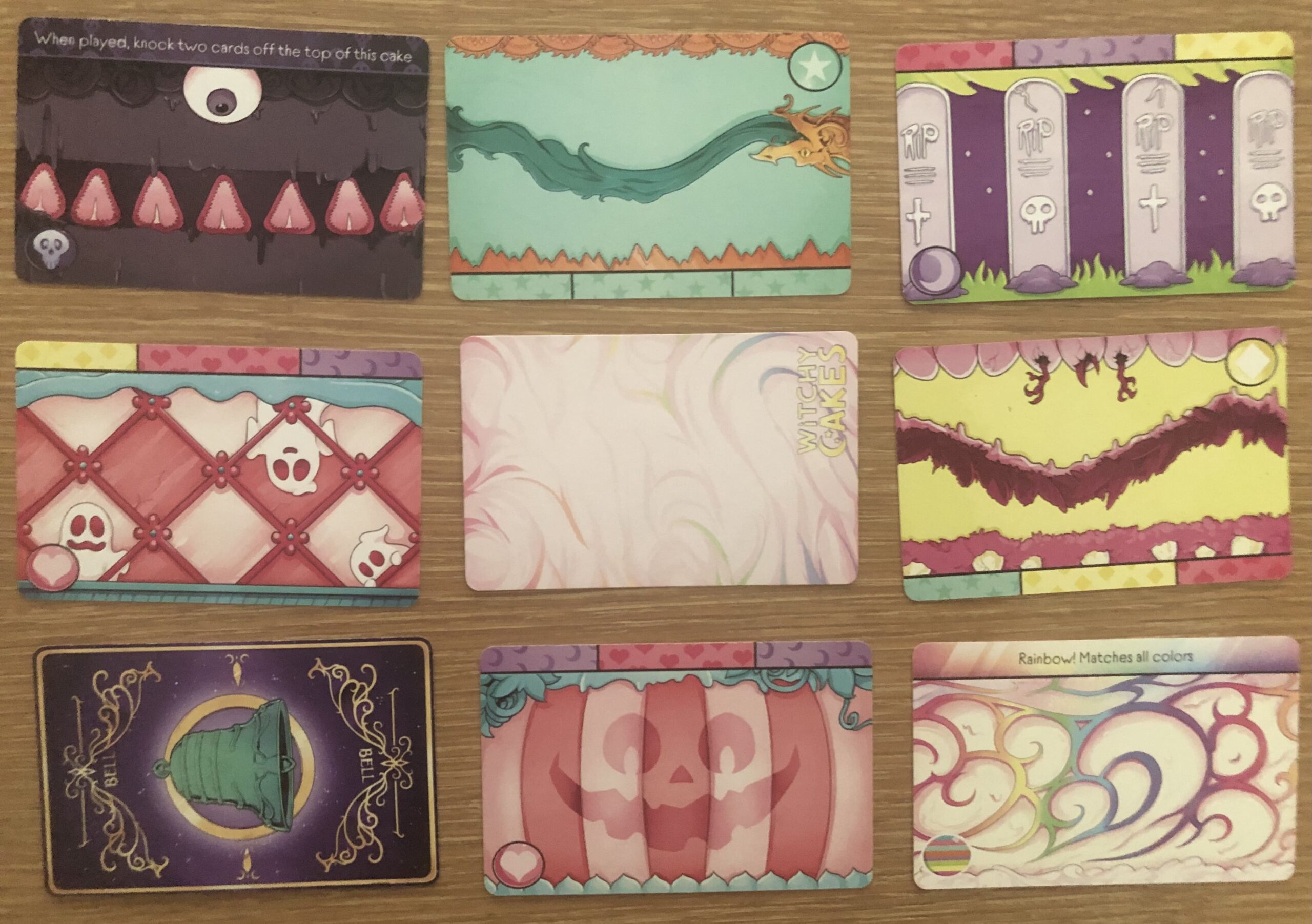 There are two other components to Witchy Cakes. The ones that mean something mechanically are secret ingredients (you start with one and get a replacement when you draw a new hand). These can be played at any time for a variety of effects – play or throw more layers, rearrange cake layers, swap card locations around, that sort of thing.